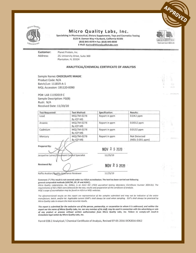 We took notice and took action, shutting down production and putting Chocolate Magic through the most rigorous testing processes available. Heavy metals in food can cause a widespread host of health issues, including death in extreme quantities. We’re thrilled to report that Planet Protein is as clean as they come! Especially when compared to some major brands cited by Consumer Reports